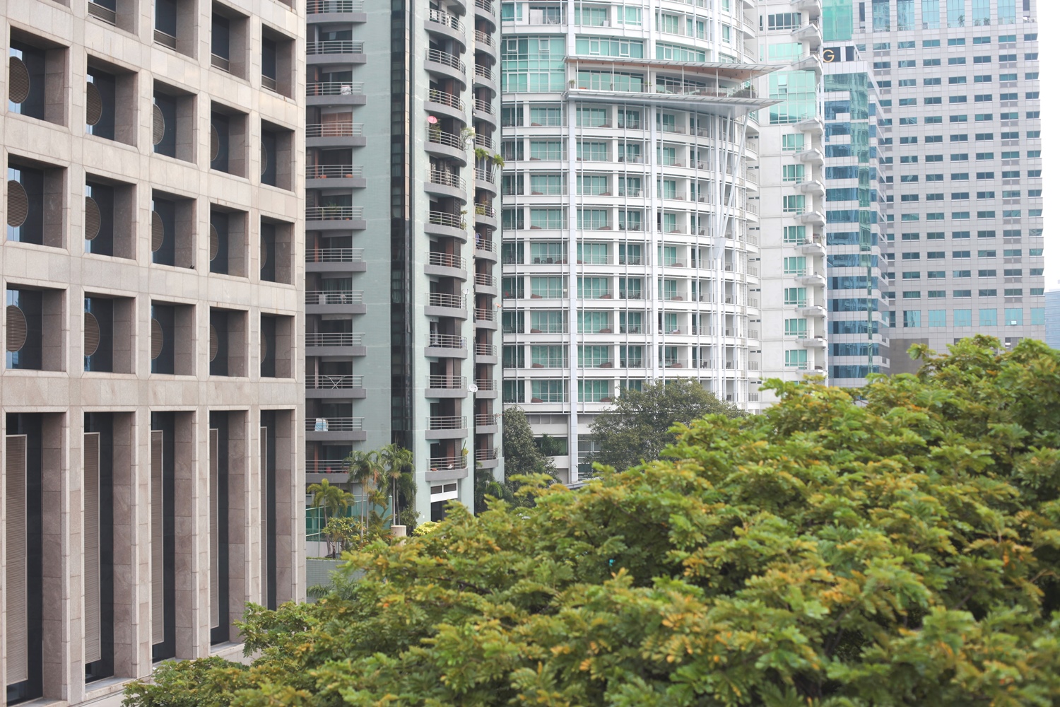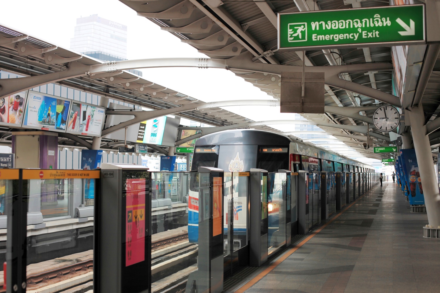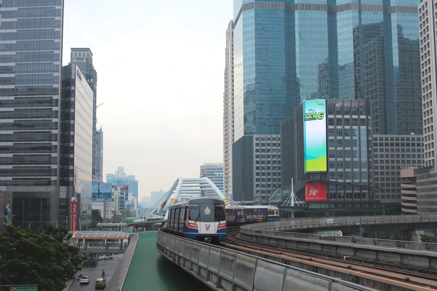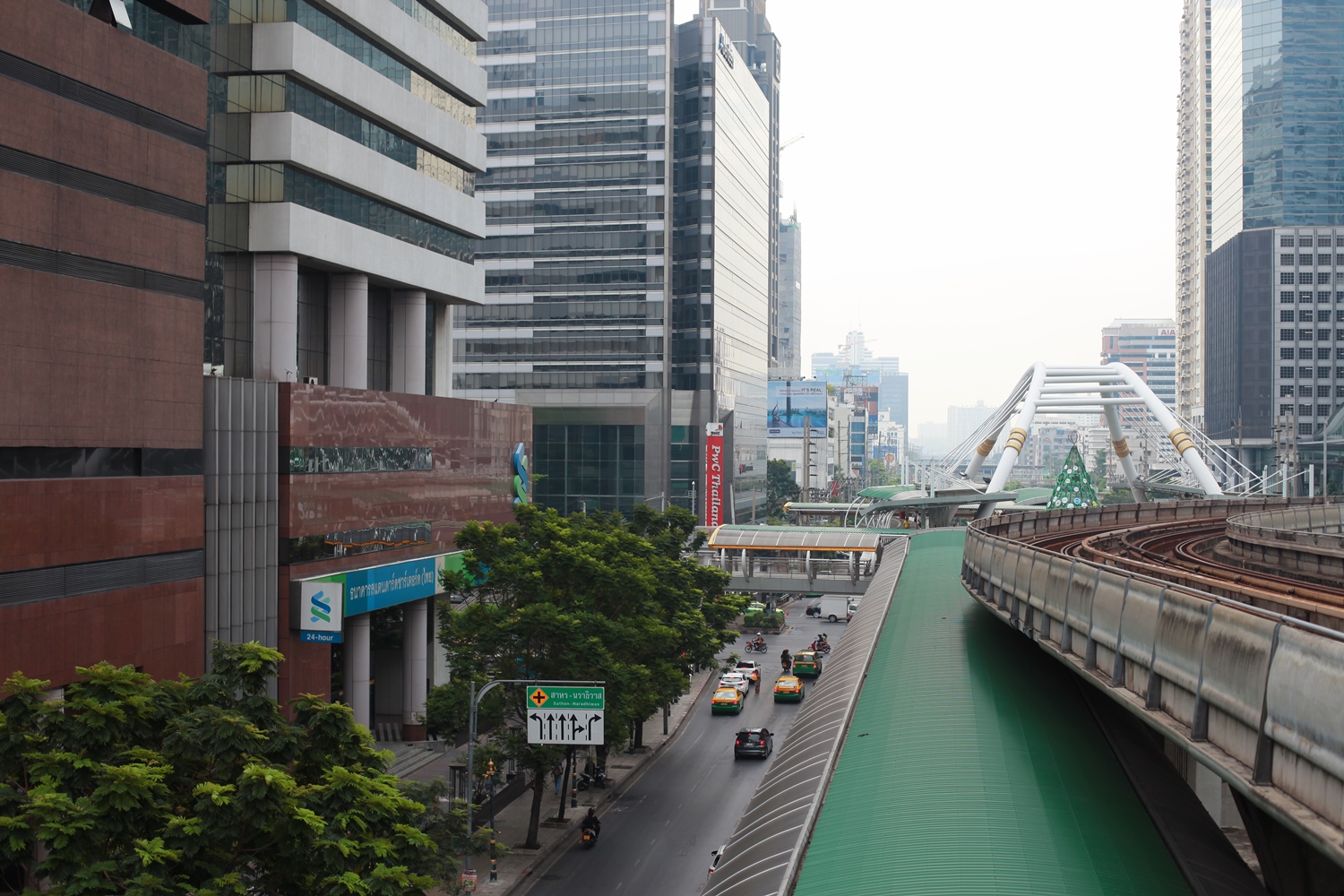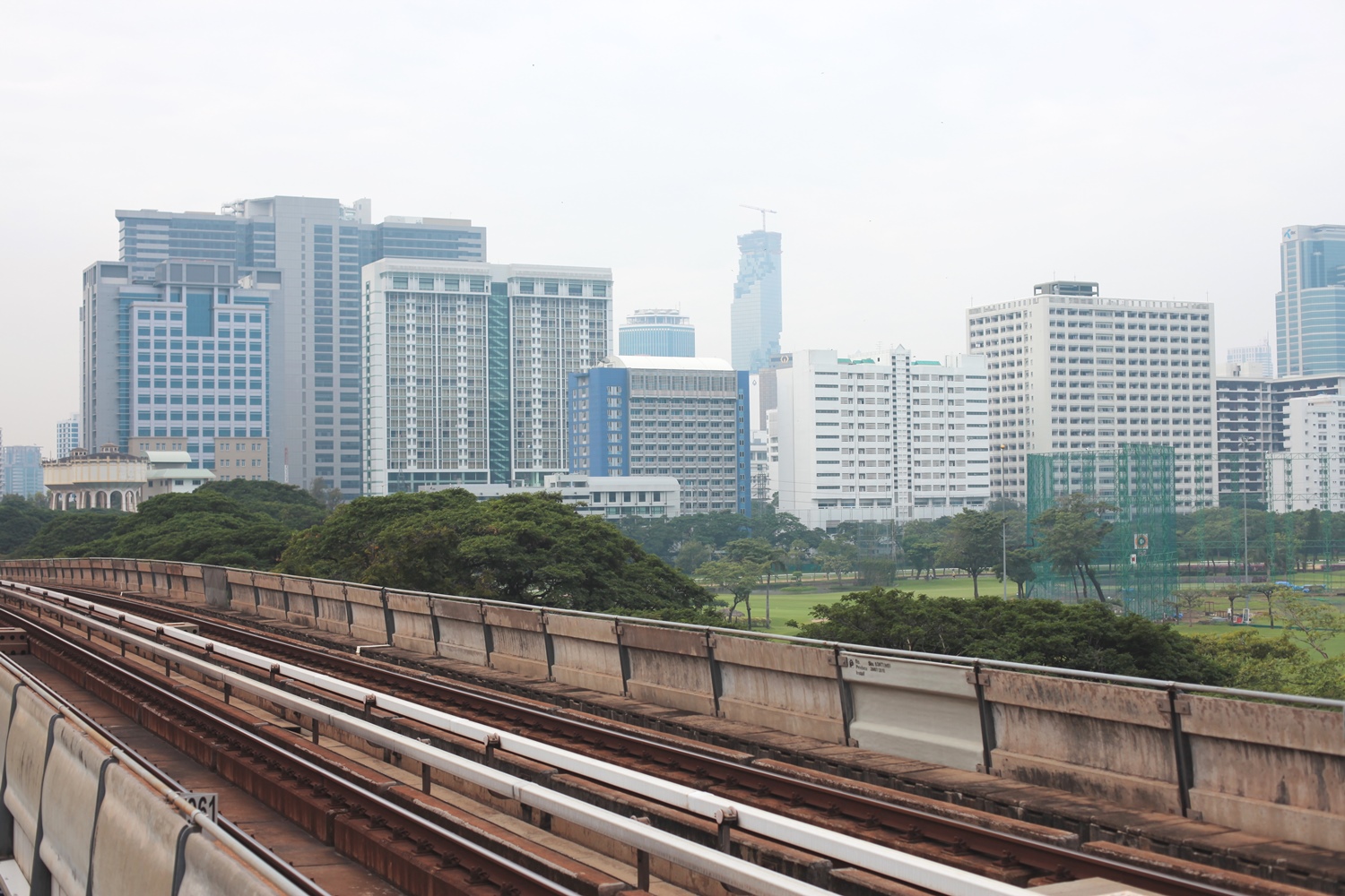 サイアム駅から南に3駅目のチョンノンジ駅からの景色。大きくカーブした路線が高層ビル群の谷間を縫うようにして走る様子は、”撮り鉄”の方々にとっては垂涎モノではないでしょうか。