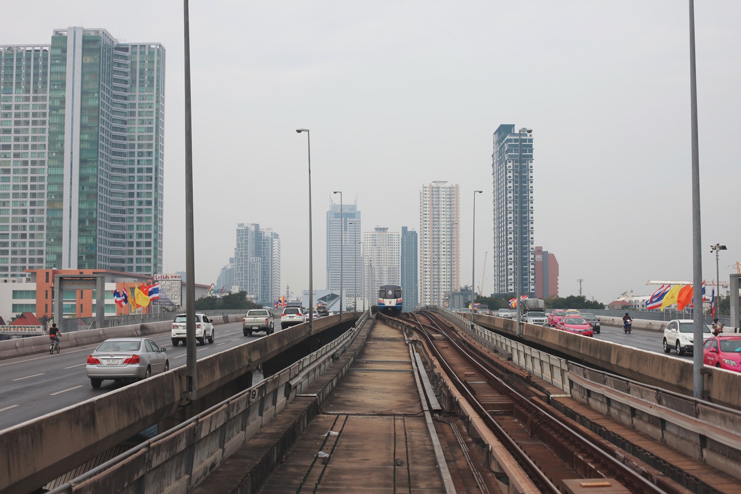 サイアム駅から6駅目のサパンタクシン駅からの景色。鉄道や道路はチャオプラヤ川に掛かる橋の上を走っています。