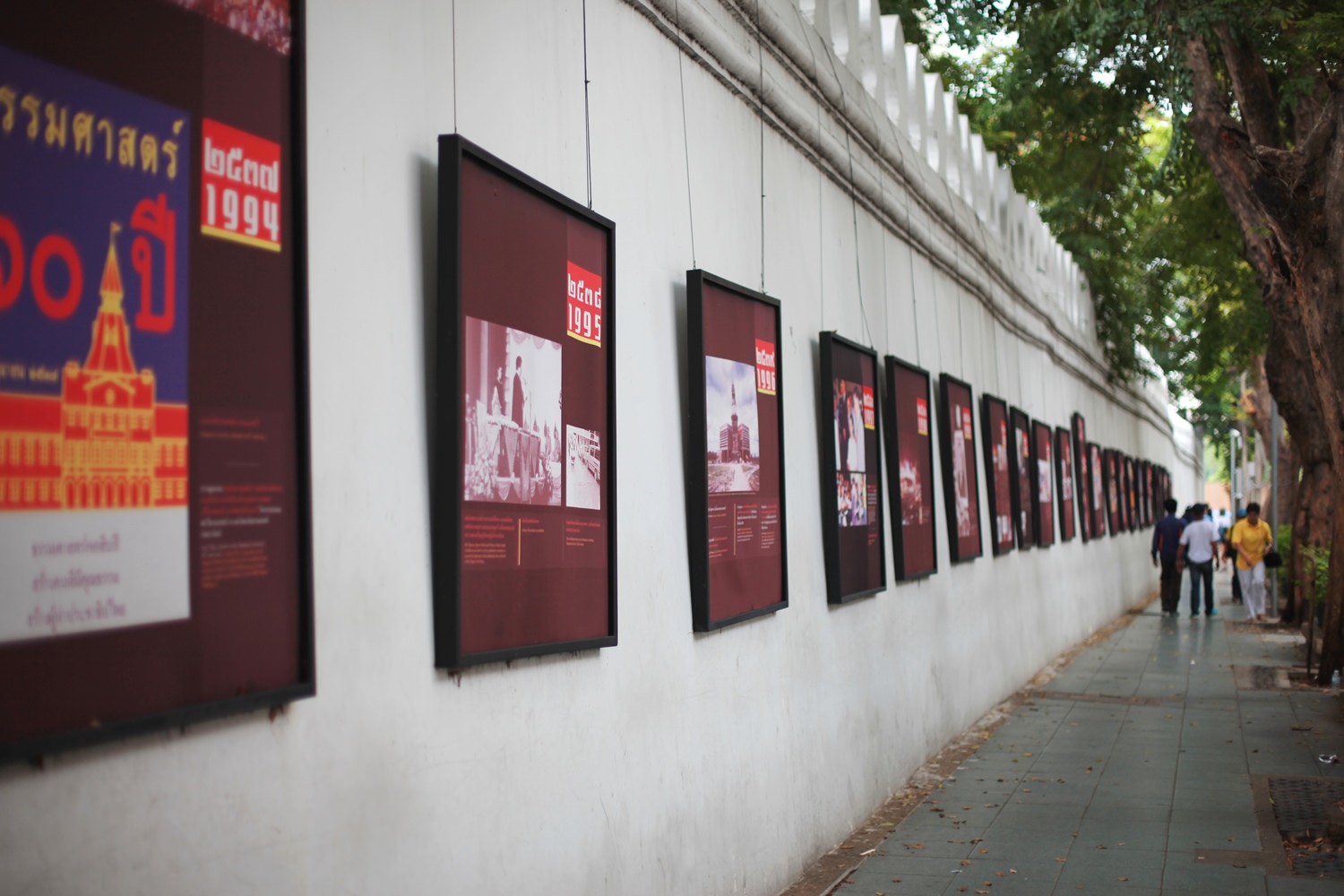 写真は大学南側の通りの様子で、敷地境界の壁面に大学の沿革がポスター表示されています。戦中戦後の項目には日本のことも紹介されていました。