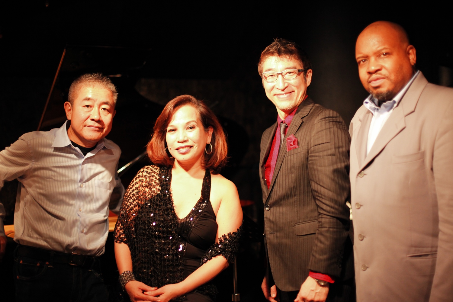 下の写真はライブ演奏後にお店のスタッフの方達と記念撮影をしているのを見て、スッと割って入って撮らせてもらった1枚です。左から、ユキ・アリマサ(piano)、チャリート(vocal)、中村健吾(bass)、ジーン・ジャクソン(drums)