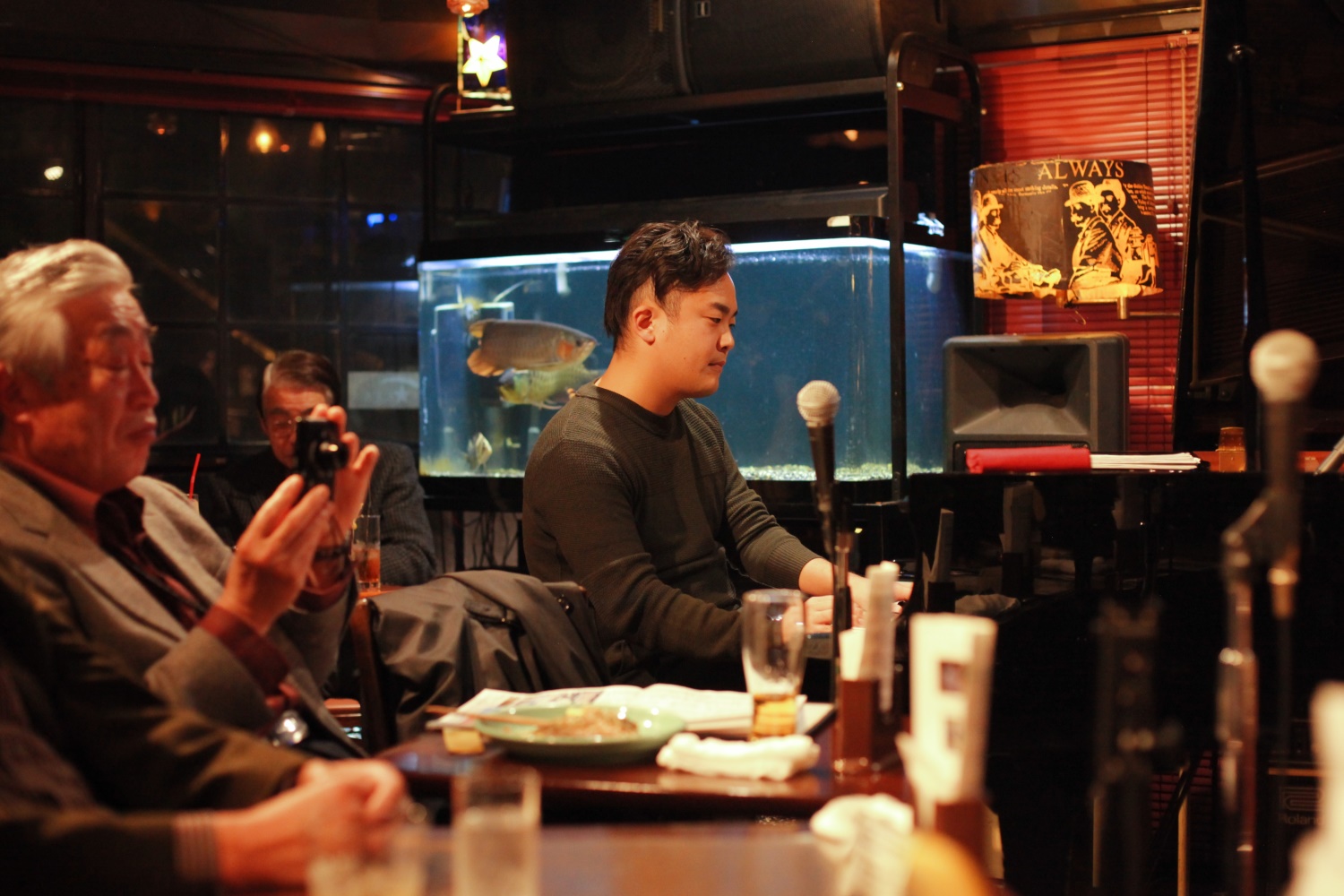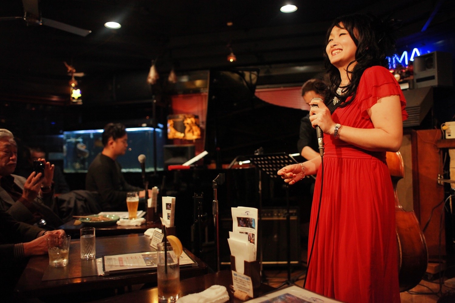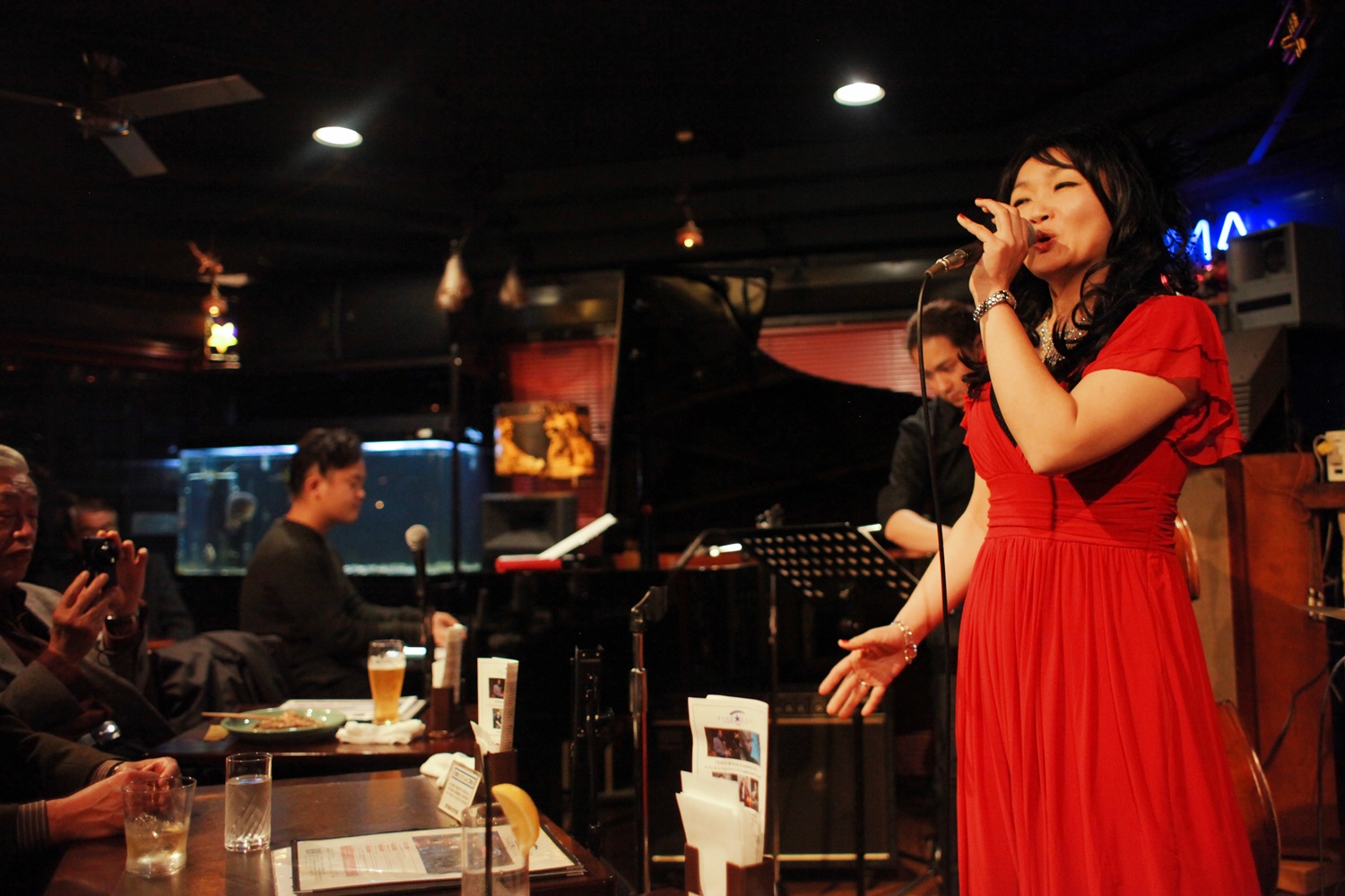 それはまた、会場となったライブバーについても同様です。インテリアの隅々にまでプロの手が行き届き、ライティングに関しても驚くほど照度の落とされた中で非常に効果的にシンガーやアーティストにスポットが当たる様に工夫がなされています。