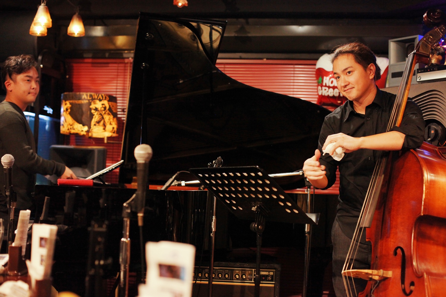 また、ステージの合間合間には演奏者の方々が客席までやって来て一緒にお酒を飲みながら会話が出来るので、ライブに来たというよりは個人宅のゲストルームに招かれて、そこで顔見知りのミュージシャンが演奏しているという雰囲気で、これ以上アットホームな空間は無いと言っても過言ではないかもしれません。