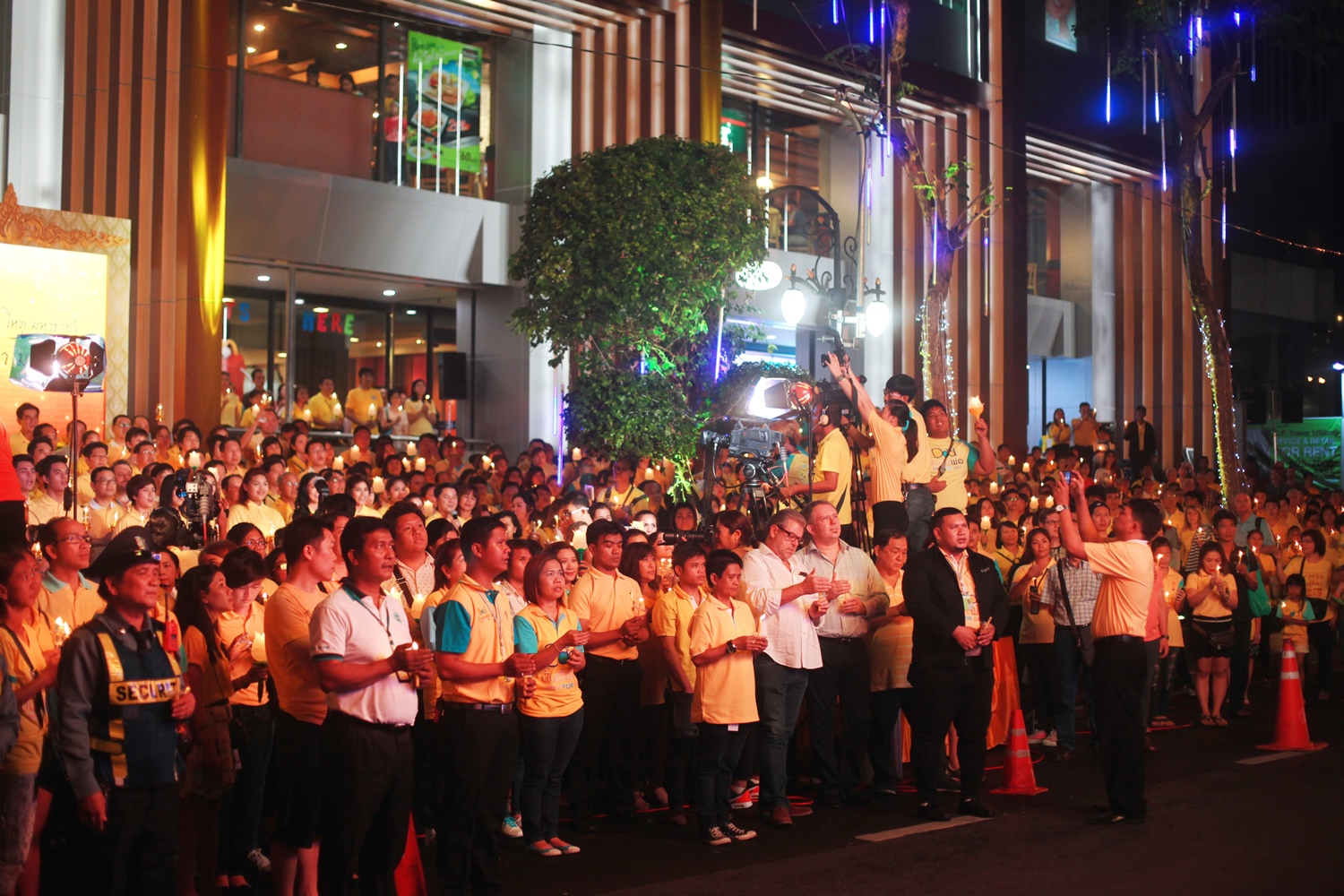 BTSの高架下のシーロム通り。ここでは恐らく道行く人々が自発的に立ち止り、国王の生誕を祝い皆で大声で合唱(タイ国歌もしくは国王賛歌だと思います)していました。