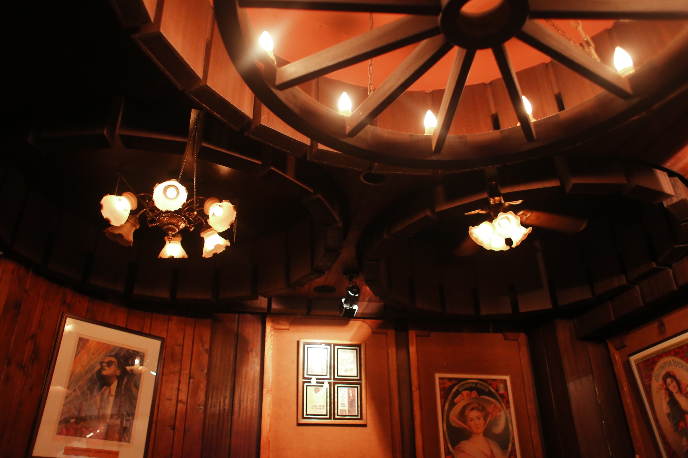 店内のインテリアは船の内部をイメージしていて、木の素材がふんだんに使われています。店内は驚くほど灯りが落とされているのですが、白熱灯を思わせる幾種もの照明によって空間全体が暖色系に彩られています。